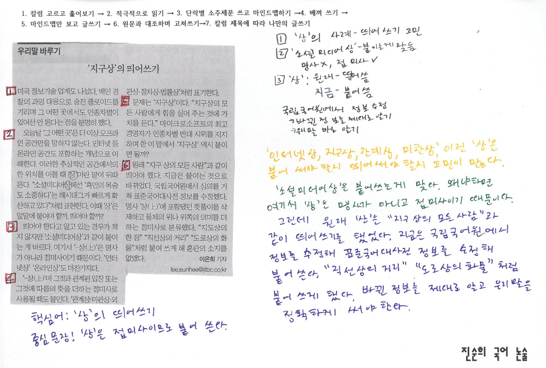 원래 “지구 상의 모든 사람”과 같이 띄어야 했다. 지금은 붙이는 것으로 바뀌었다. 국립국어원에서 심의를 거쳐 표준국어대사전 정보를 수정했다. 명사 ‘상(上)’에 포함됐던 뜻풀이를 삭제하고 물체의 위나 위쪽의 의미를 더하는 접미사로 분류했다. “지도상의 한 점” “직선상의 거리” “도로상의 화물”처럼 붙여 쓰게 해 혼란의 소지를 없앴다.