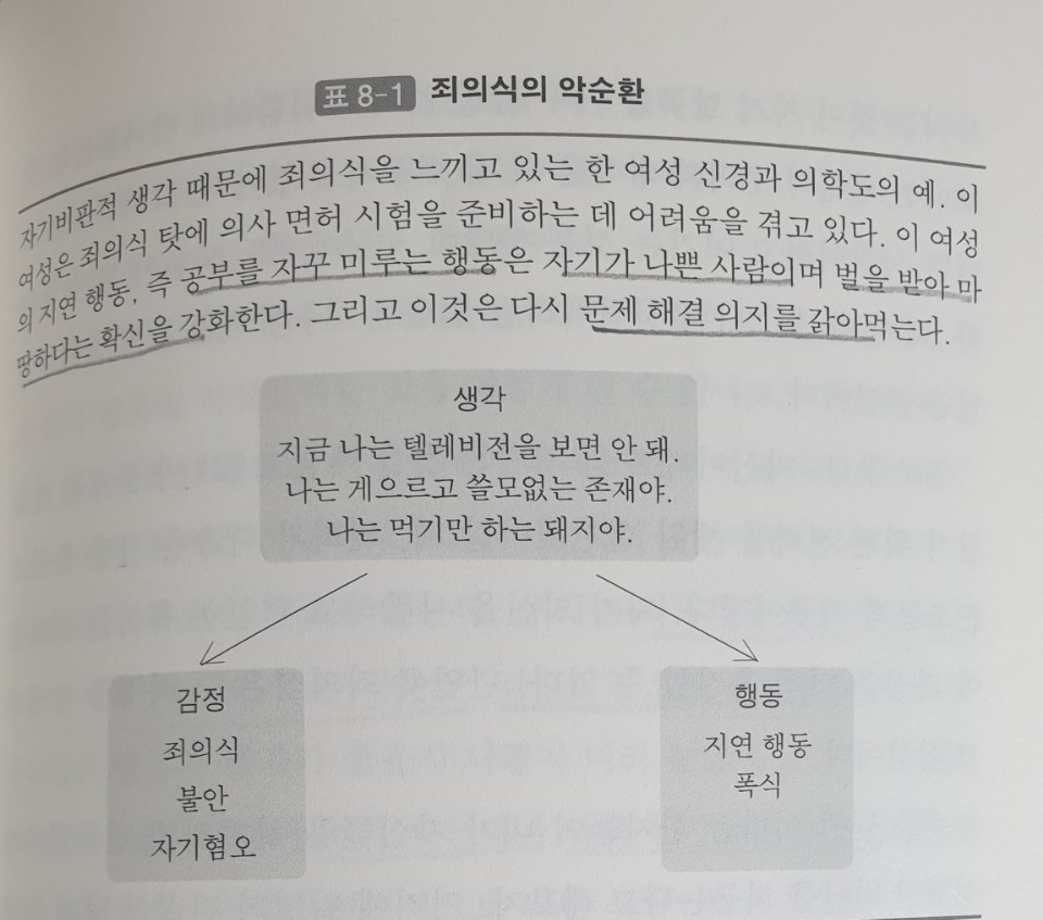 죄의식은 자기 스스로 나쁜 사람이라는 확신을 줄 뿐만 아니라 더 깊은 죄의식으로 몰고 간다는 데에 문제가 있다. 『필링 굿』에서 소개하는 ‘죄의식의 악순환’을 보자.