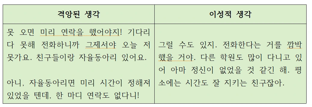 펄펄 끓는 생각을 식히기 위해 활용하는 두 칸 기법은 “격앙된 생각과 이성적 생각”으로 나누어 분노를 줄이는 기술이다.
