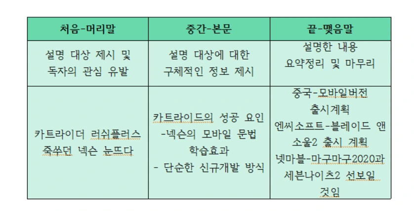 그러면 카트라이더가 설명할 대상이네. 그거 설명하고 ‘카트’를 구체적으로 어떻게 설명할 건데? 했더니 꼼꼼하게 표에 써넣었다.