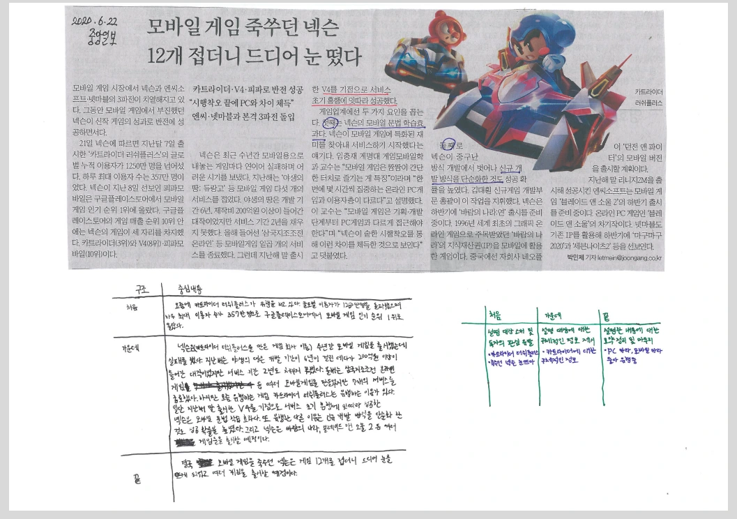 성우가 게임과 관련된 기사를 가위로 잘라냈다. 기사에 대한 정확한 독해가 필요해서 글의 구조에 맞게 구조도를 그린 다음 내용을 채우게 했다.