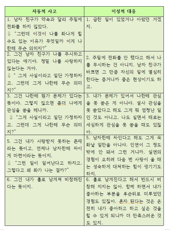 (1) 누군가 나를 비난하면, 나에게 뭔가 문제가 있다는 생각이 자동으로 들어 기분이 비참해진다.