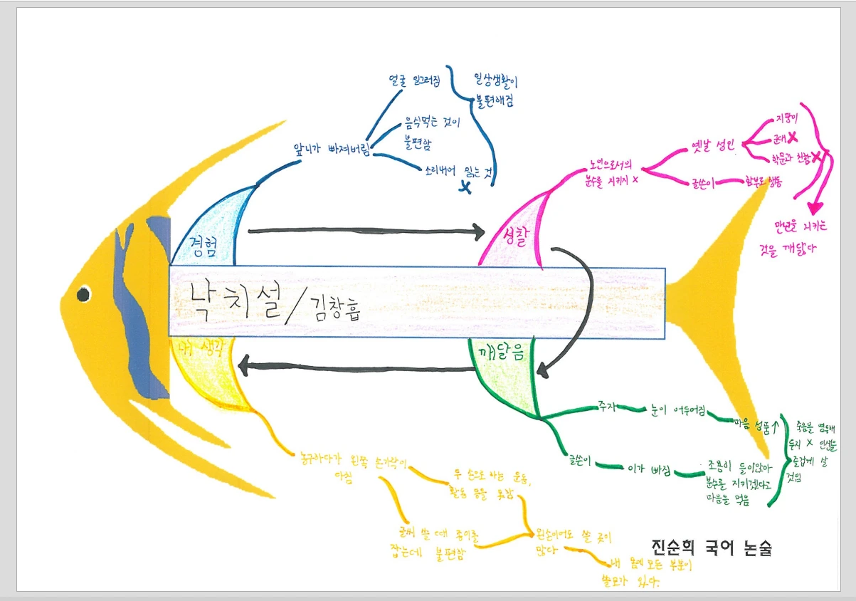 학원에 온 아이들에게 일단 <낙치설> 원문과 과제를 출력해줬다. 고전 수필인 설說에 대해 설명을 해주고 한 단락씩 내용 정리를 하고 주제까지 찾아보게 했다. 늘 하던 대로 단락별 소주제문을 찾고 내 생각까지 말하게 한 다음 마인드맵으로 정리하고 한 편의 짧은 글을 쓰게 했다. 참고로 한문 수필은 ‘설說’은 ‘사실과 의견’이나 ‘체험과 깨달음’의 2단 구성으로 이루어지는 것이 대분분이며 ‘설說’은 대체로 비유적으로 주제를 드러낸다.