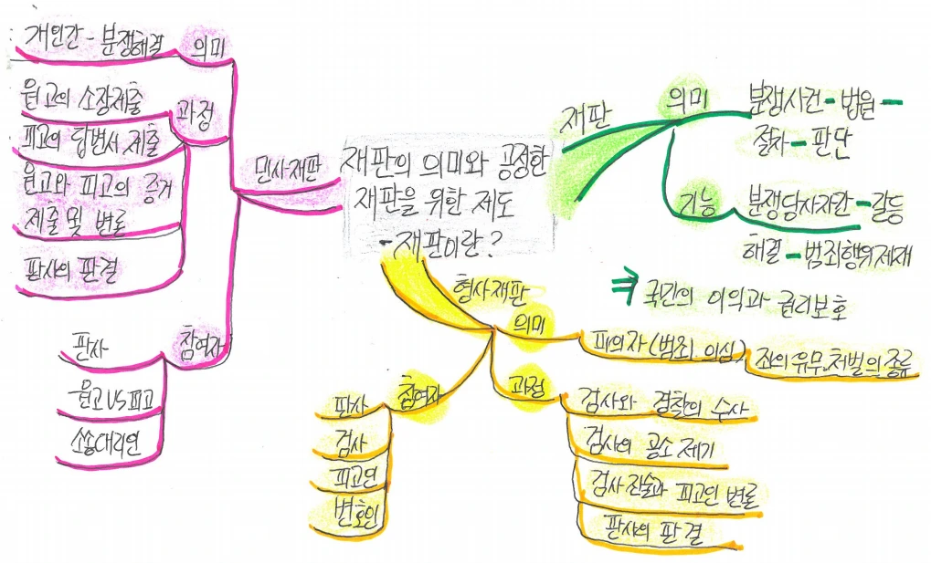 유물과 유적은 책에 나와 있는 대로 그려보고 표로도 정리했다. 그런 다음 역사 교과서를 읽으니 산만한 은석이도 큰 흐름이 잡혀가기 시작했다. 인강을 들으며 사회교과서-1) 재판이란 무엇일까 마인드맵한 것을 보여주며 하는 방법을 설명해줬다.