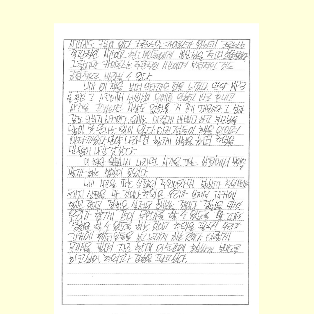 상담 시간을 정했음에도 불구하고 앞 시간의 아이가 글을 늦게 써서 중1 아이와 다영이 가족의 상담 시간이 겹쳤다. 중1 여학생이 간 다음에 다영이가 말했다.