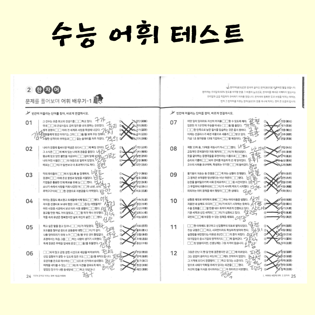 꿈을 담는 틀의 『중학국어 일등급 어휘력』과 고교내신·수능국어 어휘교재인 마더텅 출판사의 『국어1등급어휘력』을 같이 나간다. 중1이어도 중학 어휘력과 수능 대비 어휘력을 같이 나가는 이유는 중학 어휘력의 단어가 부족해서라기 보다 문제가 쉬워서이다. 암기하지 않아도 풀 수 있도록 문제가 구성되어 있어서 조금만 눈치 빠른 아이들은 외우지 않고 그냥 풀어버린다.