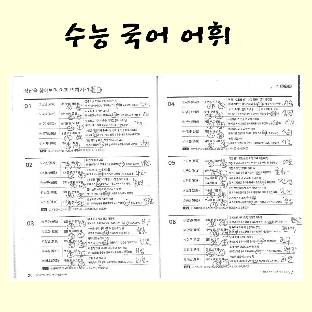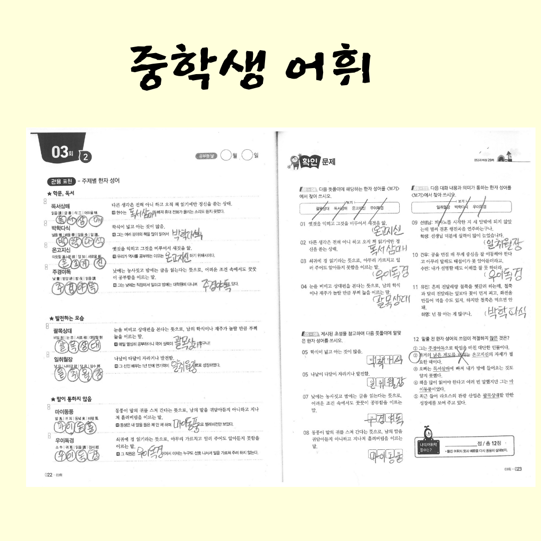 그것을 방지하기 위해 단어 옆에 붙어 있는 한문 밑에 한글로 쓰게 한다. 예문에도 동그라미를 치고 예문 끝에 단어를 다시 한번 쓰게 하는 지난한 과정을 거친다.