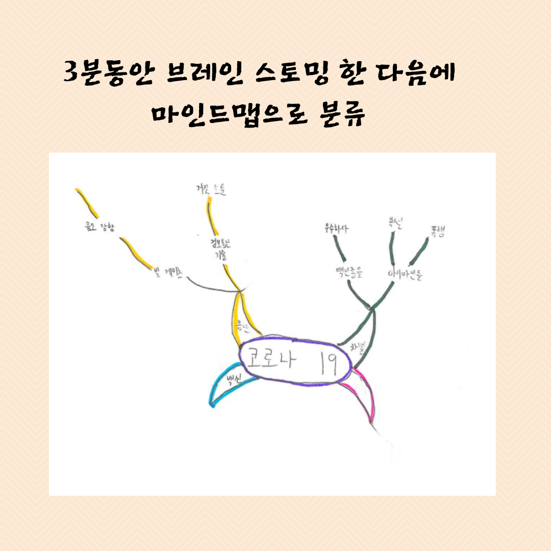 1. “코로나 19”와 관련된 떠오르는 단어를 브레인스토밍하고 마인드맵을 했다.