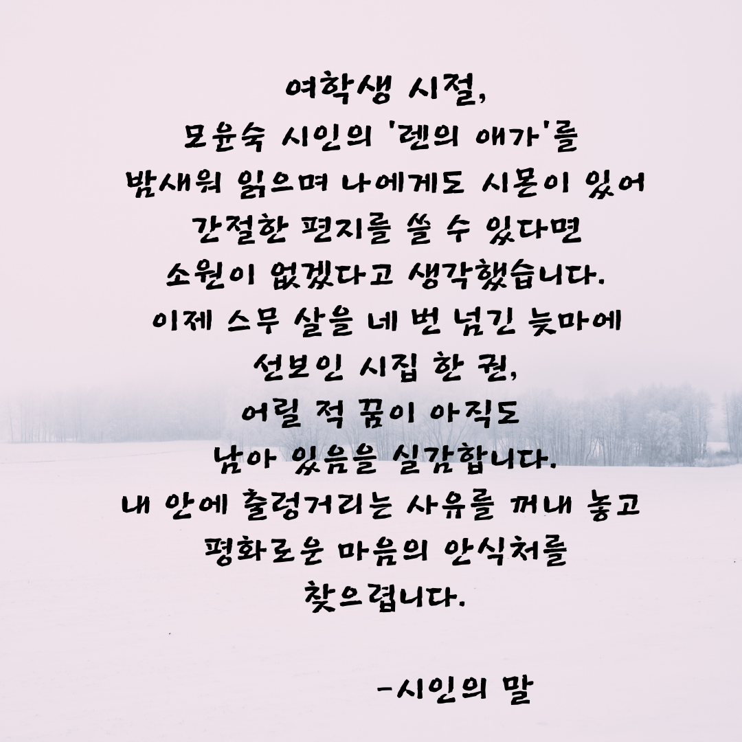 '시인의 말'에 언급되어 있듯이 이 시를 쓴 이정현 님은 스무 살을 네 번이나 넘긴, 갓 노년에 접어든 시인이다. 화자는 각설탕을 녹이다. 어느 날 불쑥 찾아온 하얀 기억의 한 조각을 길어 올린다. 가을비 내리던 저녁 어스름에 '나'를 위해 "장작불 피워 방 데워 놓고" 기다려 주던 다정한 사람 하나를 말이다.