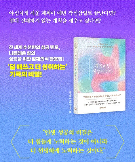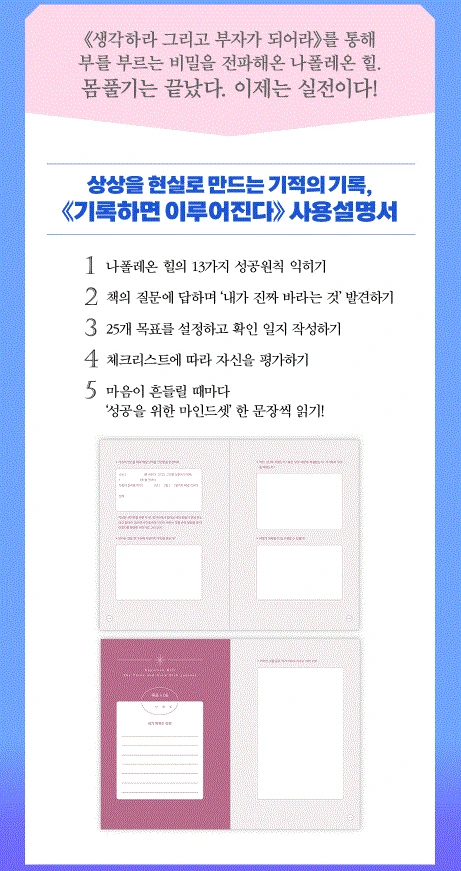 『기록하면 이루어진다』, 이 책은 성공한 사람과 성공하지 못한 사람 2만 5,000 이상의 삶을 분석해 13가지의 성공 원칙과 6단계의 실천방법으로 정리해, 독자들이 실천할 수 있도록 실천 일지를 만들어 놨다.