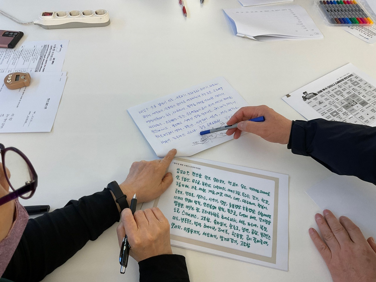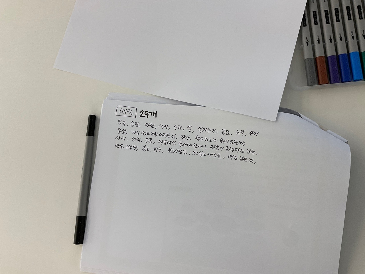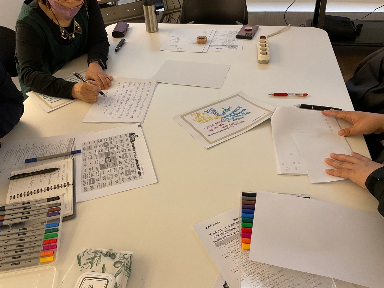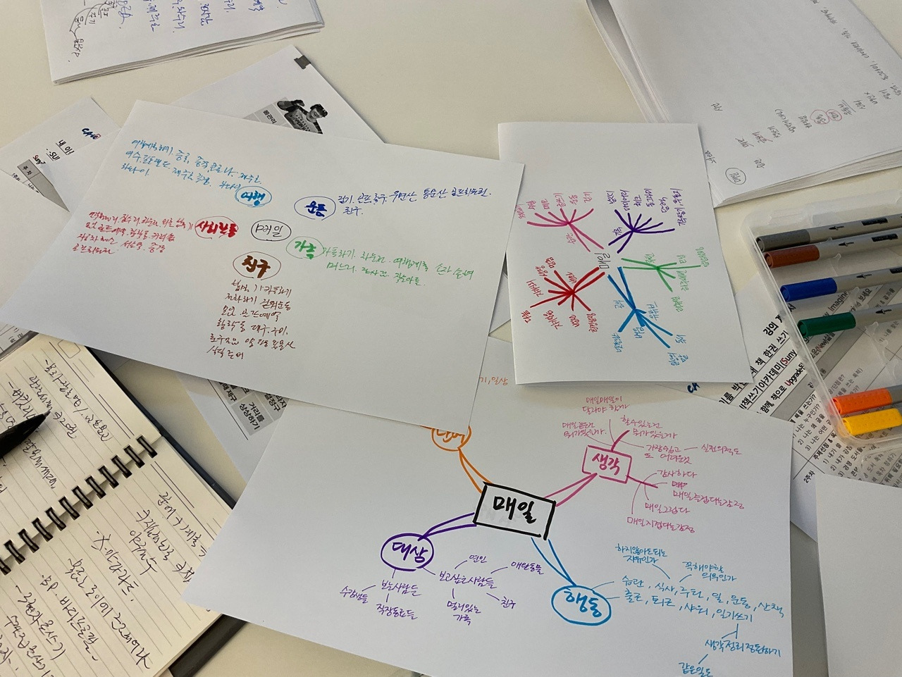 모범글을 분석하고 그래픽조직자로 정리한 다음 단어 하나를 갖고 브레인 스토밍하며 마인드맵으로 정리하는 과정을 익힌다. 수업 시간에는 '매일'이라는 단어를 갖고 브레인 스토밍을 3분 동안 실시했다. 이것을 바탕으로 마인드맵으로 분류하고 위계화하는 것을 했는데 작가님들이 엄청 몰입하며 했다. 성인들 대상으로 수업할 때 트윈펜으로 브레인스토밍하고 마인드맵을 색깔별로 분류하며 단어를 쓸 때 신이 나서 좋아들 한다. 한쪽은 붓펜과 다른 한쪽은 플러스펜 같은 양쪽으로 쓸 수 있는 트윈펜을 준비해 연습해보고 난 뒤에 선물로 드렸다. 처음부터 선물로 준비한 것은 아닌데, 집에 가서 연습해 보고 싶어 해 그것도 괜찮겠다는 생각이 들었다.