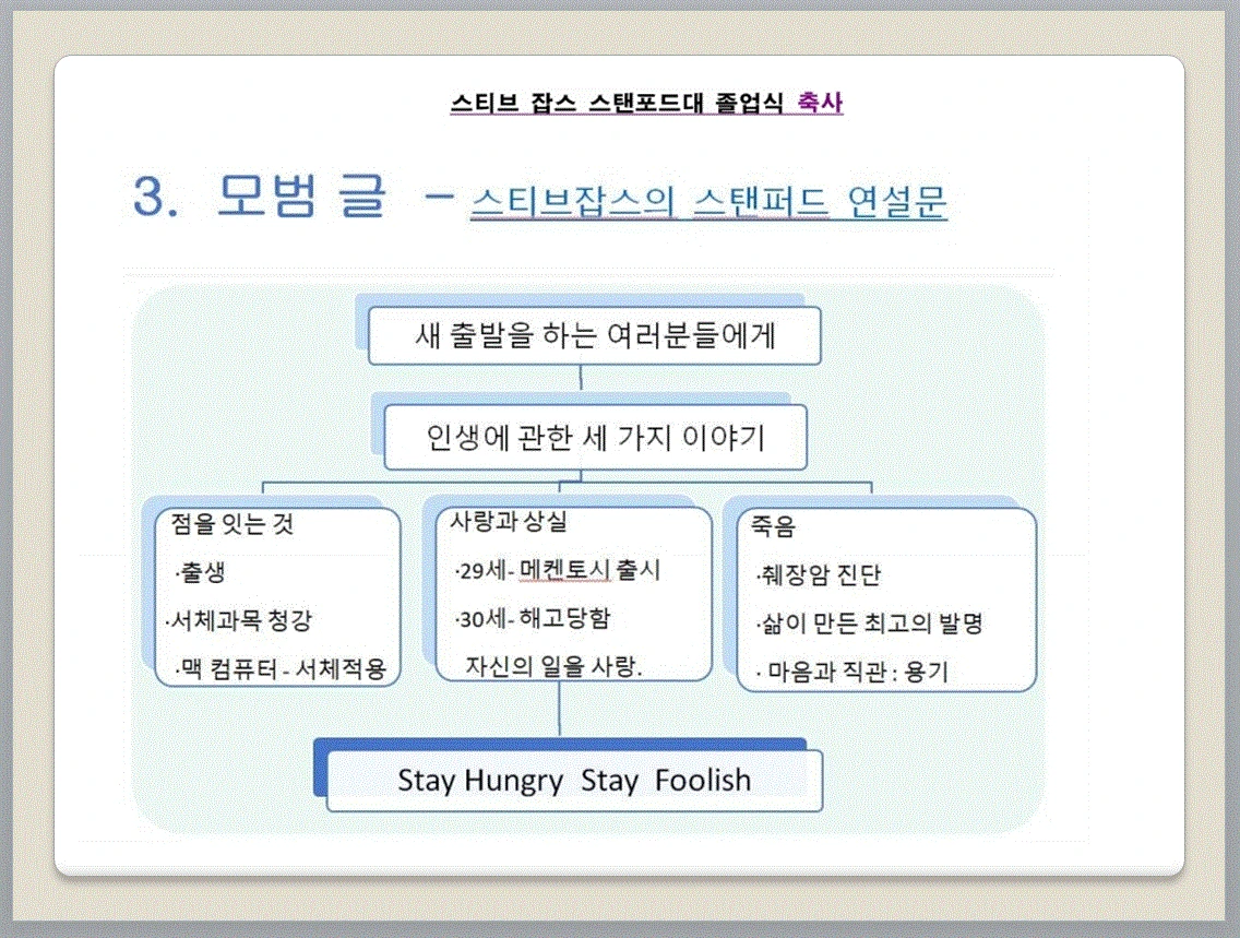 잡스의 글을 분석한 다음 짧은 칼럼 한 편도 더 나갔다. 벚꽃이 비처럼 미련 없이 떨어지는 것을 보고 스티브 잡스와 연결한 수원대 이주향 교수가 쓴 '꽃비 같은 인생'을 분석한 다음 그래픽조직자로 정리한 글도 함께 읽어 내려갔다.