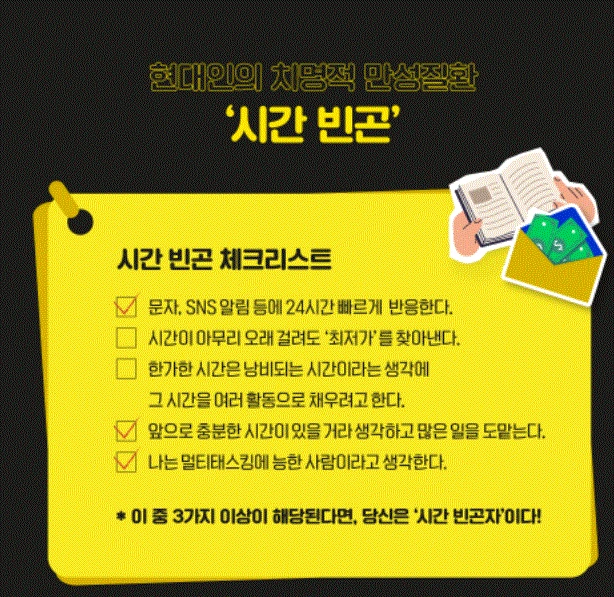‘루틴을 벗어나, 나만의 속도로 사는 법’이란 부제를 단 『시간을 찾아드립니다』가 이 달의 필독 도서였다. 책에서는 ‘시간 빈곤’을 현대인의 치명적인 만성질환으로 진단하고 있다. 소개된 ‘시간 빈곤 체크리스트’를 보니 안타깝게도 모두 다 해당됐다.