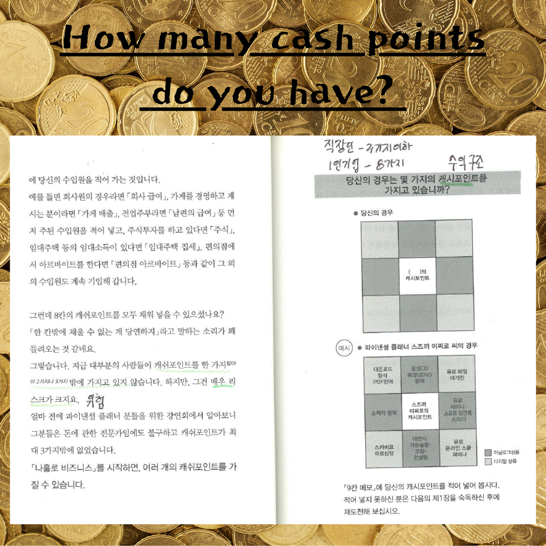 고용되어 일하는 시대는 이미 끝장났다며 나홀로 비즈니스가 세계적인 흐름이라며 강조한다. ‘수입원’을 말하는 ‘캐시포인트’가 여러 개 돼야 함을, 특히 ‘나 홀로 비즈니스’로 돈과 자유를 손에 넣기 위해서는 더더욱 그래야 함을 주장한다. ‘나홀로 비즈니스’를 하면 “여러 개의 캐시포인트를 가질 수 있다”는 글을 보는 순간 김호 작가의 『쿨하게 생존하라』의 ‘8개의 모자’와 ‘슬래시 효과’가 생각났다. 직업과 관련해 8개의 모자(무엇이 재미를 만들어 내는가)는 ‘자신이 살아가면서 좋아하거나 사명감을 갖고 있는 분야가 여덟 개는 되어야 한다’는 것이다. 슬래시 효과(무엇이 돈을 만들어 내는가)는 관심사와 수입의 원천을 여러 개로 늘리는 노력을 뜻한다. 현재 몸 담고 있는 커리어와 함께 새롭게 수익 창출을 가져다주는 수입의 원천을 복수로 만들려는 노력이 곧 캐시포인트를 다양하게 만드는 일이리라.