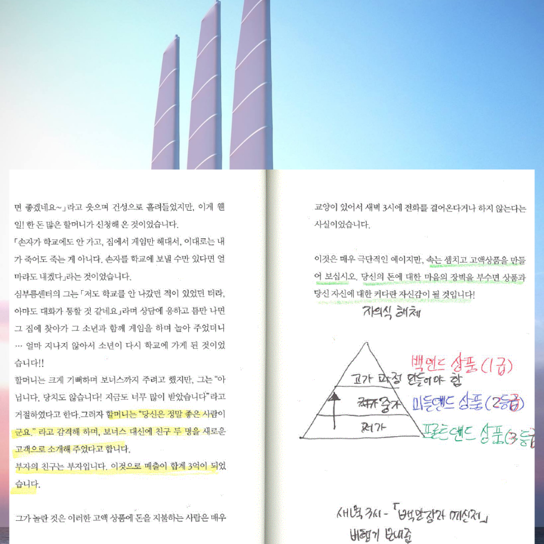 상품의 가격을 설정할 때 “싸게, 많이 팔 생각은 금물”이라고 3 단계별 상품을 설명한다. 3급의 프론트엔드 상품 front-end은 저렴한 가격으로 손님을 끌어오는 입구에 해당된다. 2급의 미들엔드 상품 middle-end은 중간 가격으로 백앤드 상품으로 이어지는 다리 역할을 한다. 1급의 백엔드 상품 back-end는 고액으로 이익이 크기에 경영 안정으로 이어진다. 1급의 백엔드 상품은 “발상을 전환하여, 최종 목표인 백앤드 상품의 가격을 얼마로 설정할 것인가를 우선 생각”하는 전략은 빌 비숍의『핑크 펭귄』에 나오는 구르메 패키지와 유사하다. 고급 차별화로 매출을 늘리는 구르메 패키지를 통해 오히려 중간 가격대인 미들엔드 상품의 매출을 가볍게 유인할 수 있을 것이다.