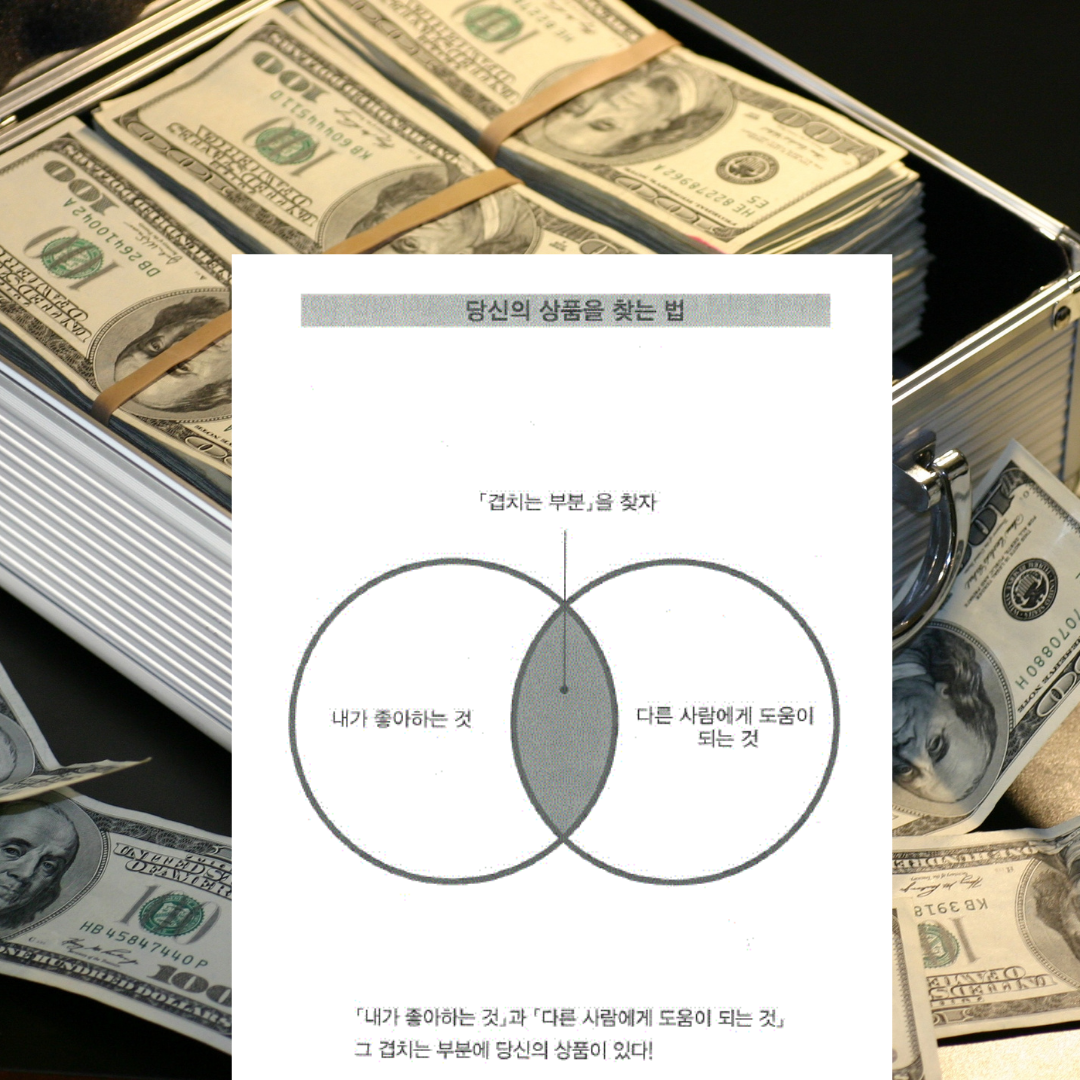 “「당신의 상품」을 원하는 사람은 분명히 있다!” 편에서는 “자기가 좋아하는 것”과 “다른 사람에게 도움이 되는 것”이 일치되는 부분이 많을수록 “나홀로 비즈니스”는 잘 풀린다고 언급한다. 그 겹치는 부분에 당신의 상품이 있단다.