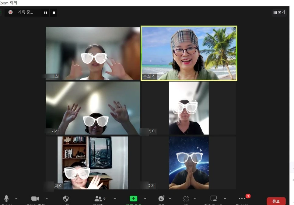 수업 시작할 때 녹화 버튼 누르고 참여자들과 함께 사진 촬영을 해야 해요. 매번 할 때마다 사진 촬영하는 것을 놓칩니다. 처음엔 녹화할 수 있는 '기록' 누르는 것도 빠뜨렸어요. 녹화하는 것을 몇 번 빠뜨려 수업을 다시 해야 했지요.