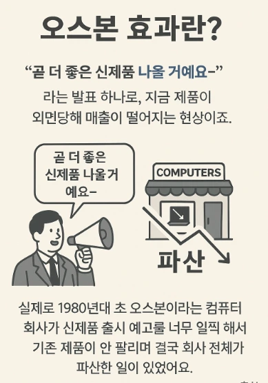오스본 효과는 아주 단순해요. “곧 더 좋은 신제품 나올 거예요~”라는 발표 하나로, 지금 제품이 외면당해 매출이 떨어지는 현상이죠.실제로 1980년대 초 오스본이라는 컴퓨터 회사가 신제품 출시 예고를 너무 일찍 해서 기존 제품이 안 팔리며 결국 회사 전체가 파산한 일이 있었어요.
