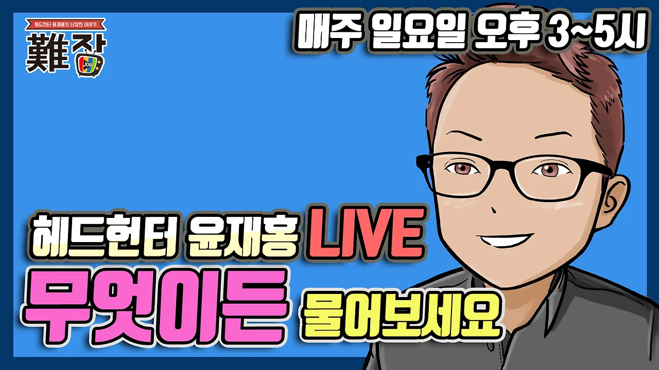 2019년 6월 9일(일)부터 매주 일요일 오후 3~5시 헤드헌터 윤재홍의 '무엇이든 물어보세요' 유튜브 라이브 방송을 시작 합니다.