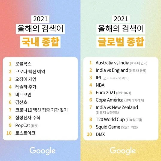 구글 트렌드에서 2020년 대비 2021년 급증한 검색어를 정리했어요. 로블록스, 코로나 백신 예약, 오징어 게임, 테슬라 주가, 비트코인 등 올해 하루에도 몇 번씩 언급됐던 키워드가 상위권을 차지했네요! 오징어 게임은 국내뿐 아니라 세계 검색 순위에서도 높은 순위(9위)를 차지했다고. 더불어 구글플레이에서 올해 최고의 앱/게임을 발표했는데 국내 베스트 앱으로는 밀리의 서재가, 베스트 게임으로는 쿠키런 : 킹덤이 꼽혔어요.