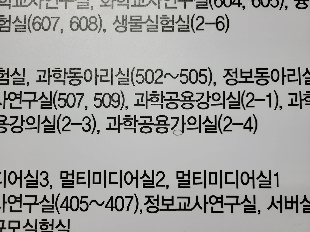 '과학공용가의실'에 빠진 종성 ㅇ을 누군가가 써넣었다. 필체에 성의는 좀 없어 보이고 ㅇ을 붙여 넣었더라도 자형이 아름답지는 않지만 우리 학교에서 쉽게 발견하기 어려운 의외의 장면이다. 그 상황에 대한 상상을 마음대로 펼쳐보았다.