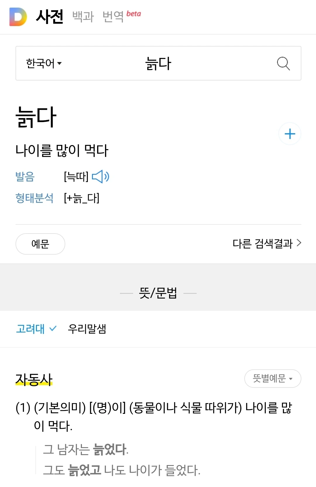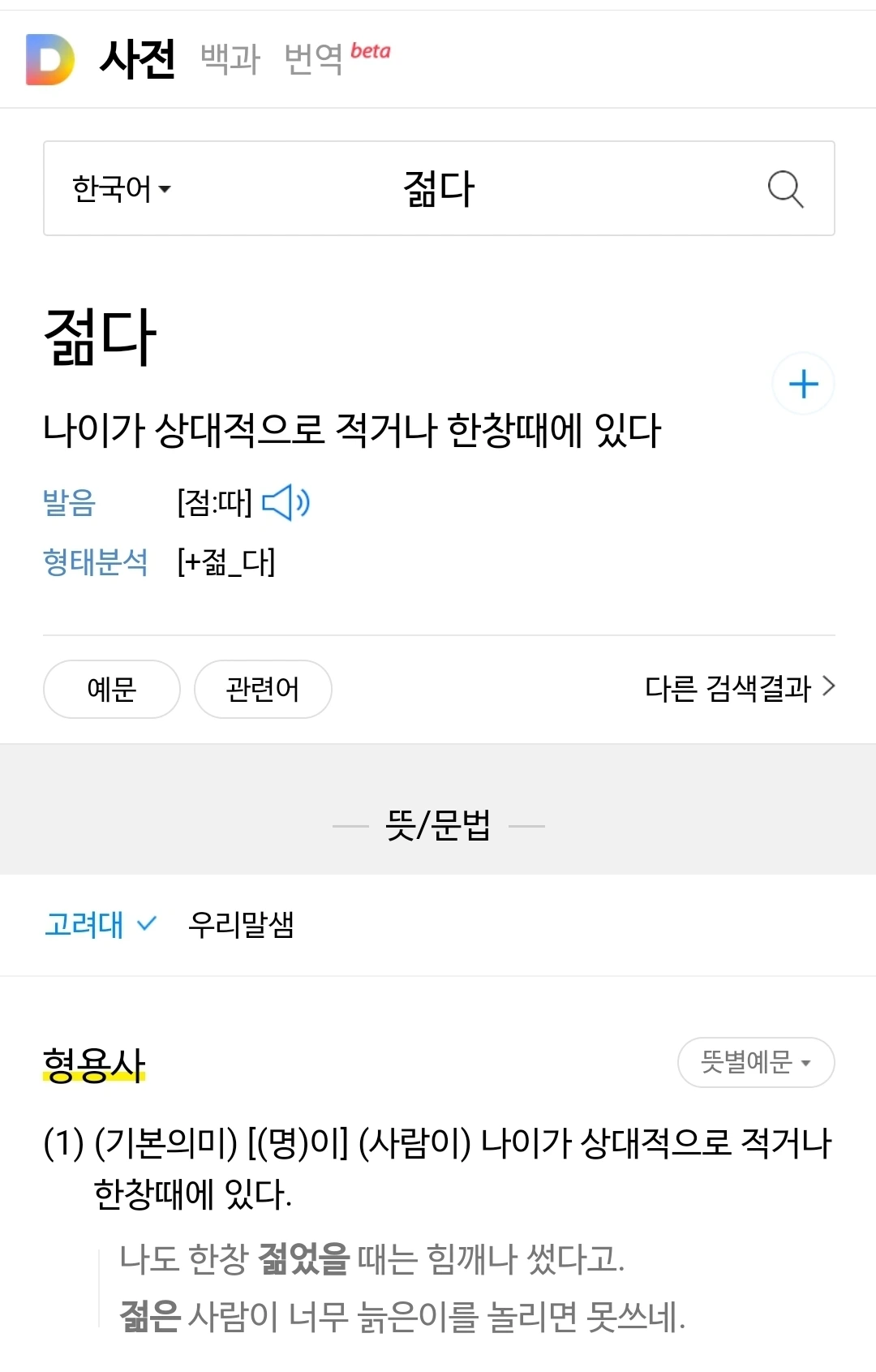 (*이에 대해 '젊다'의 반대말은 '늙다'가 아니라 '늙었다'로 보아야 한다는 주장이 있다. 반의 관계에 있는 A, B 두 단어가 서로 다른 시제를 갖는 상태에서 반의 관계로 묶인다는 것, 즉 이들 단어가 보여 주는 형태론적 비대칭성은 매우 부담스럽긴 하지만 적어도 품사류가 다른 두 단어가 반의 관계라는 모순은 해결된다는 것이다. <출처: 형용사(구) 형성에 대한 완료의 역할 연구, 오충연(2017)>)
