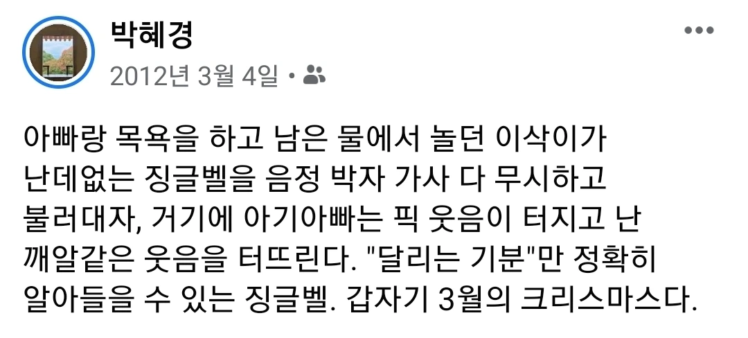 유치원에서 배운 것들과 텔레비전에서 귀동냥으로 얻어 들은 노래들이 한데 뒤섞인 정체 모를 멜로디와 가사들은 엄마를 자주 웃게 했다. 뜨뜻한 물을 욕조에 가득 채우고 이미 신이 잔뜩 난 너를 담가 놓으면 너는 미니 자동차 장난감과 함께 '달리는 기분, 달리는 기분, 달리는 기분' 만을 음정과 박자 모두 무시한 채 열 번씩 반복하던 때이른 캐롤을 불러댔다. 그럴 때면 그 달의 크리스마스가 우리 곁으로 달려왔다. 너와 함께 하는 시간들은 그렇게 온통 뒤죽박죽이었지만 아무 문제는 없었다. 개구쟁이어도 좋다, 건강하게만 자라다오, 이 말이 그 누군가의 진심이었음을 깨닫게 된다.