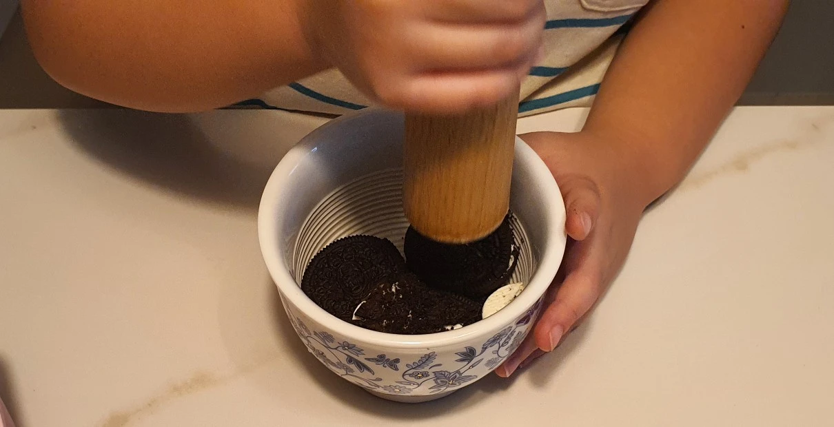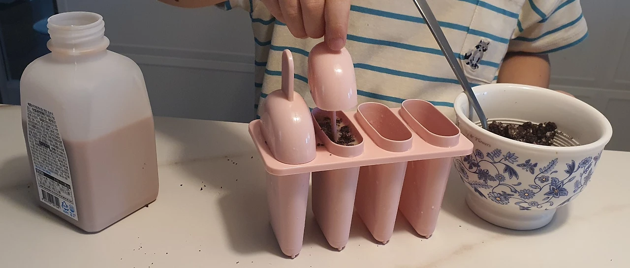 [간단 정보] 재료: 아이스크림 틀, 쿠앤크, 초코우유, 절구, 방망이, 숟가락, 냉장고 만드는 시간: 15~20분(냉동고에 넣기까지) 정리 난이도: 쉬움(밑에 쟁반이 있으면 정리하기 더 좋음, 아이 혼자 정리 가능) 아이의 뿌듯함: 자신감이 천장을 뚫음