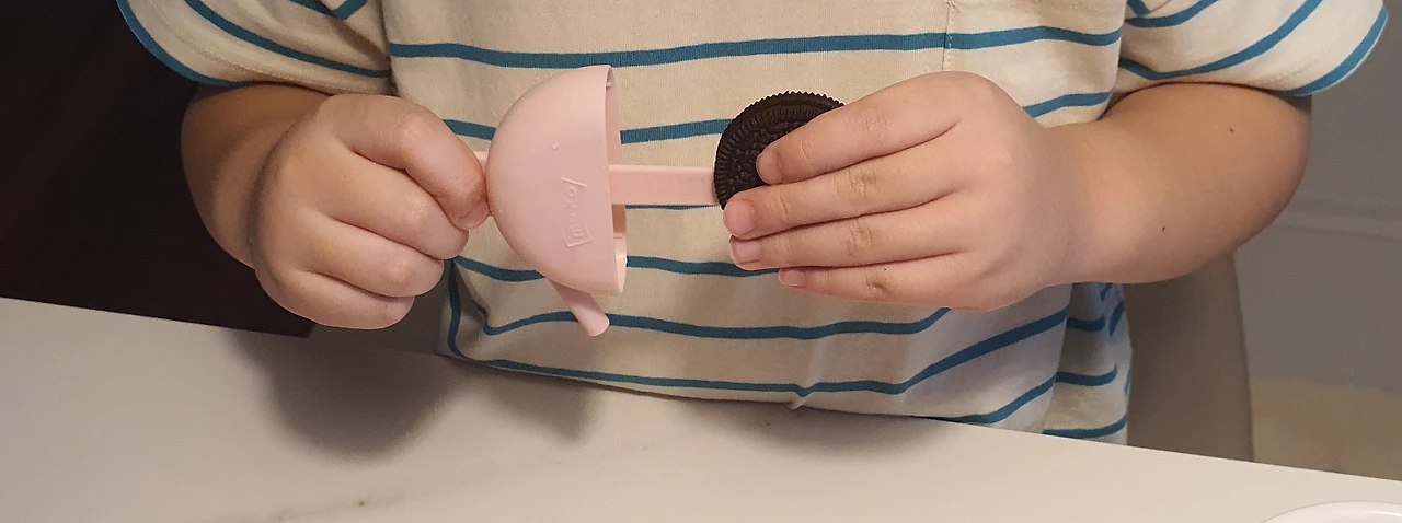 쿠키의 크림 부분에 막대를 끼우다가 과자가 양면으로 딱 나눠지자 아이는 살짝 놀란다.