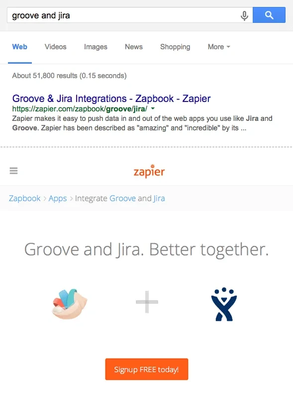 검색이 잘 되는 콘텐츠를 만들어서 초기 고객을 빠르게 끌어 모았던 서비스 중에는 Zapier가 있습니다.