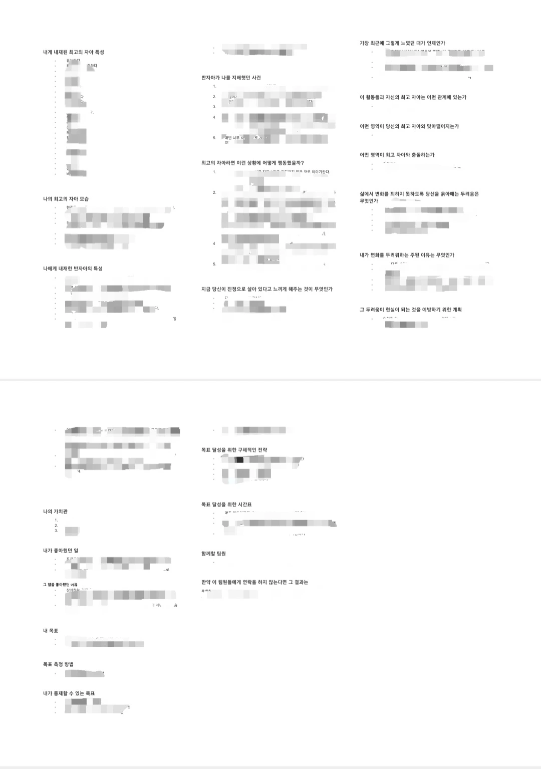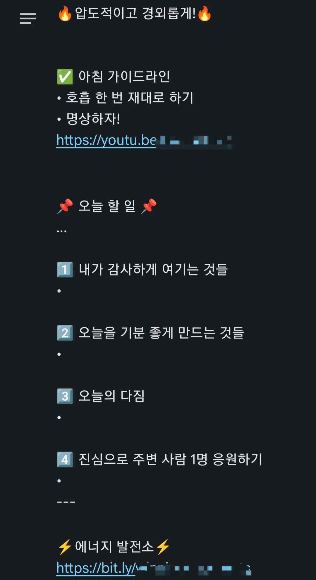 최근에는 유튜브 영상 대신 3페이지짜리 문서를 만들어서 매일 아침 일어나자마자 가장 먼저 그 문서를 읽습니다.문서는 A4용지에 출력해서 다이어리에 끼워뒀습니다. 아날로그 방식이긴 하지만 스마트폰으로 이 문서를 보게 되면 다른 요소에 정신이 팔릴 수 있는데 이를 예방할 수 있어서 좋습니다.