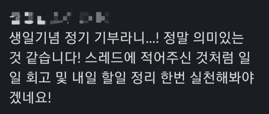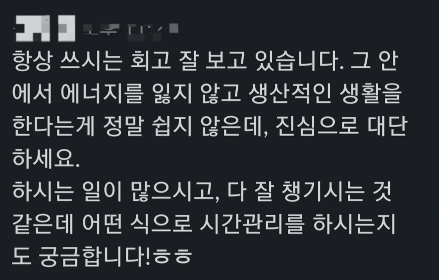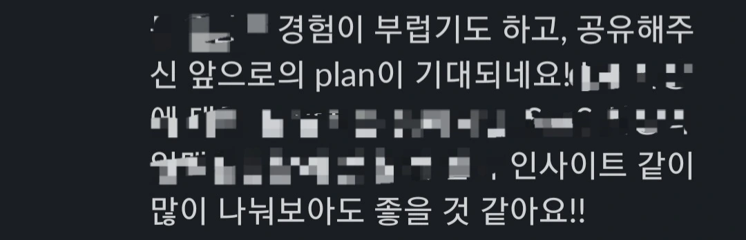 이렇게 작성한 주간 회고는 처음에 언급한 회고 모임에 공유를 합니다. 모임 구성원 분들이 회고를 보시고 댓글을 남겨주시는데, 제게 힘이 될 때가 많습니다. 다들 정말 똑똑하고 멋지게 사시는 분들이라, 격려와 관심이 더욱 힘이 됩니다.