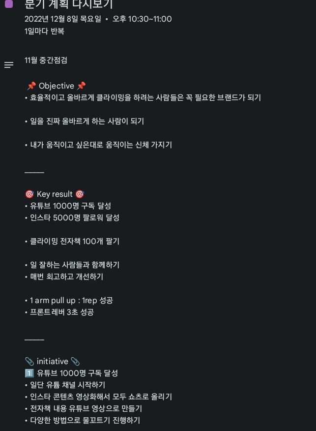 저의 작년 4분기의 분기 목표는 다음과 같이 작성했습니다. 제 2022년 4분기 목표는 제가 브랜딩 공부를 하려고 만든 '클라이머리'라는 브랜드를 잘 운영해 보는 것이었습니다. 그와 관련된 내용이니 참고 바랍니다.
