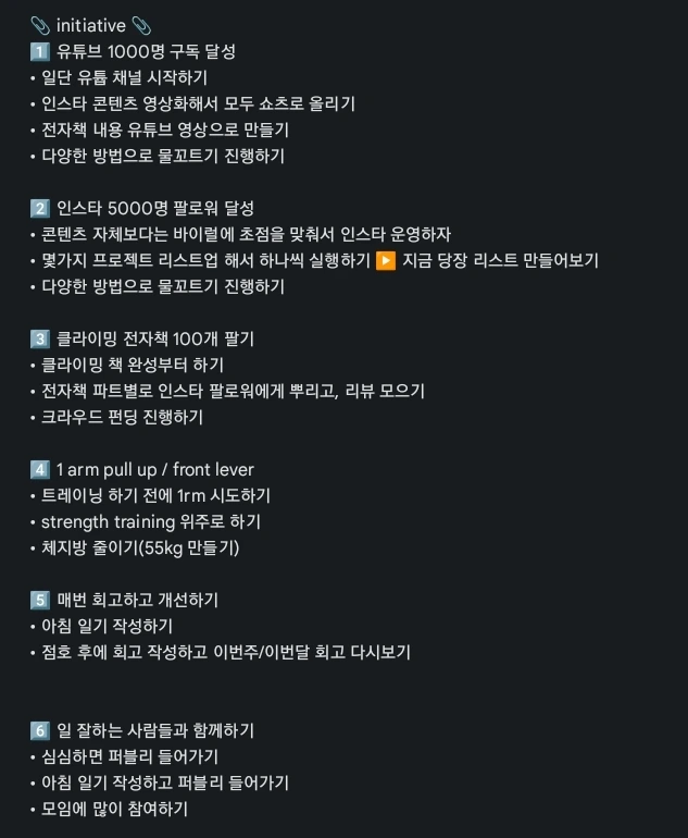 이번주에 제가 뿌듯하게 느끼는 성과를 간단하게 적는 항목입니다. 예를 들어 저번주에는 '프론트레버 5초 성공', '대회 본선 진출'과 같은 내용을 적었습니다.