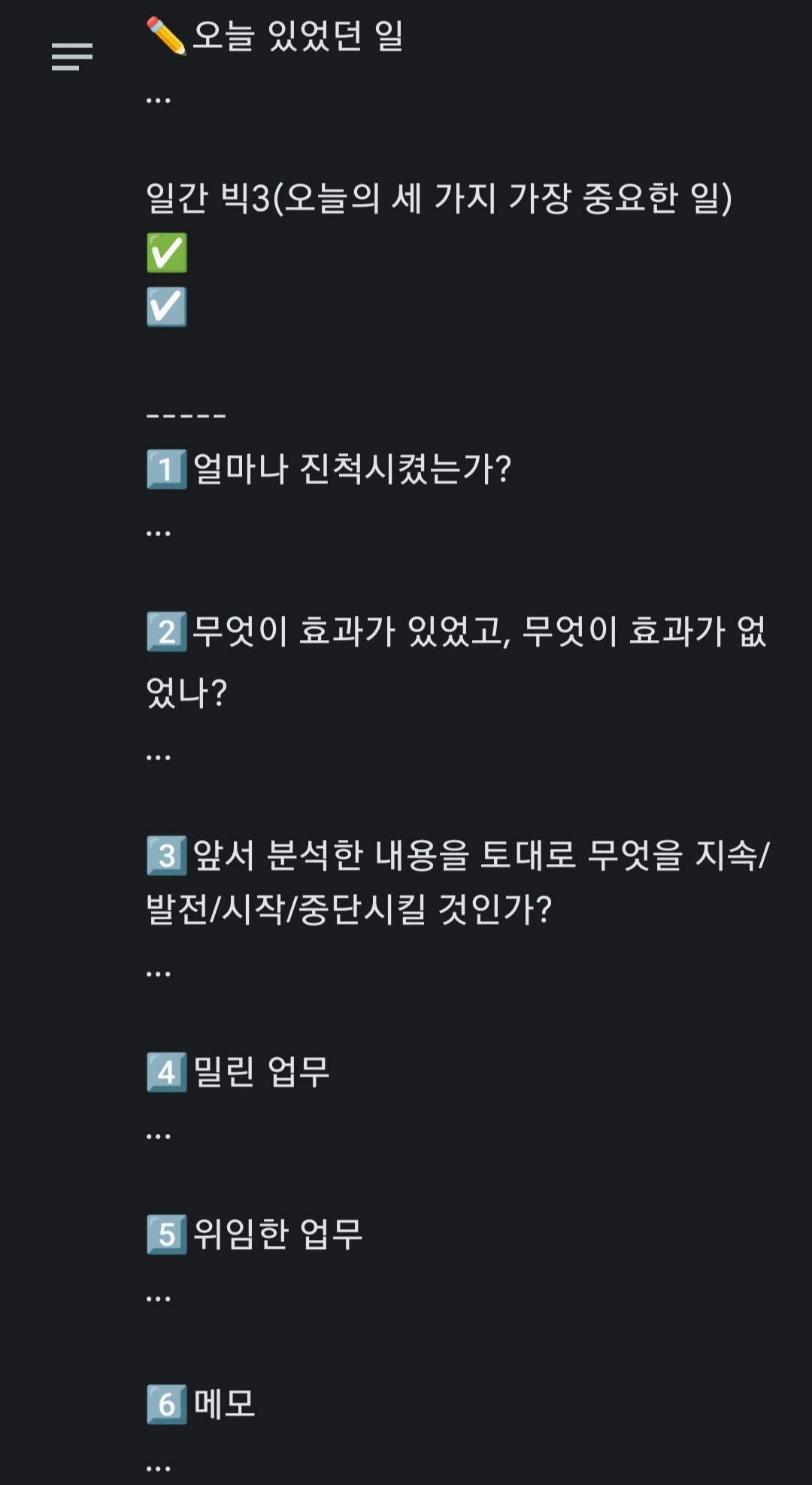 말 그대로 이번주에 저의 아쉬웠던 점과 고민을 적습니다. 일종의 '제가 해결해야 하는 문제'들인 것이죠. 역시 7번 항목에서 다음 주에 어떻게 더 개선할지 고민하기 위해 활용됩니다.