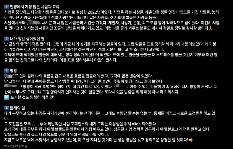 작년 내용을 지금 보니 계획에서의 부족한 점이 보이네요 ㅎㅎ 제가 작성한 분기 계획에서 '다양한 방법으로' , '많이' 등과 같이 모호한 표현들이 보이는데, 이는 좋은 예시는 아닙니다. 구체적으로 어떤 방법으로, 얼마나 많이를 명확하게 계획에 작성하는 것이 계획을 달성할 확률이 높아집니다. 계획은 구체적일수록 실천가능성이 높아지기 때문이죠.