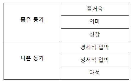 쉽게 말하면, 좋은 동기부여란, 목표를 향해 "달려나가게 해주는 동기"라고 생각한다. 반면에 나쁜 동기란 내가 쓰러져있더라도 목표를 향해" 질질 끌고서라도 데려가는 동기"라고 생각한다.
