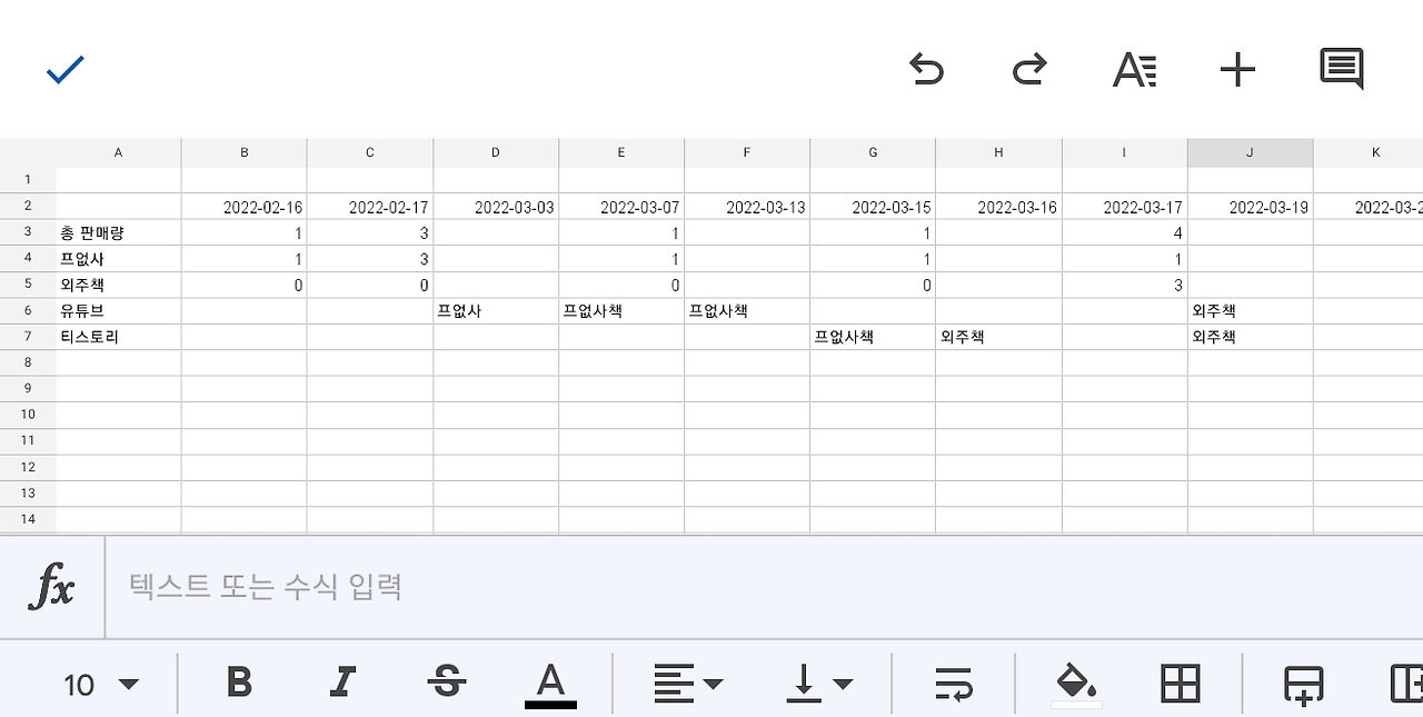 아래는 판매실적을 분석하면서 방금 만든 판매실적 기록표입니다. 이처럼 앞으로도 판매량과 어떤 판매활동을 했는지 날짜에 따라서 작성해두면 추후에 분석하기 용이할 것으로 보입니다.