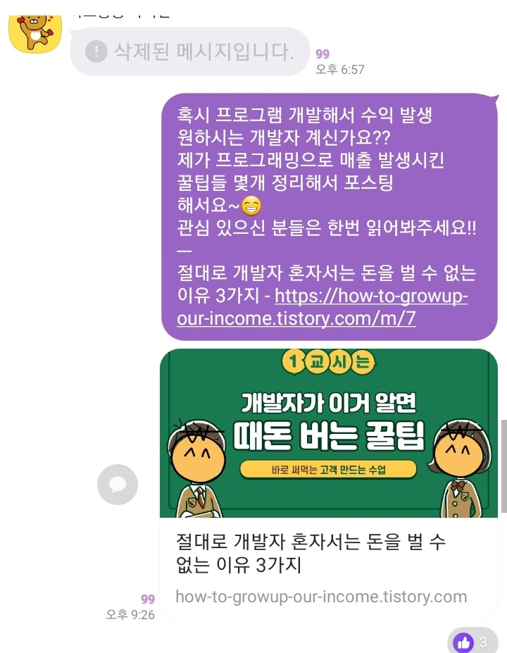 요즘에는 유튜버와 같은 인플루언서가 자신의 채널과 관련된 이야기를 나눌 수 있는 카카오톡 채팅방을 만들기도 합니다. 그래서 저는 개발에 대해 다루고 있는 유튜버, 창업에 대해 다루고 있는 유튜버가 운영하는 카카오톡 방에 들어갔습니다. 그 외에도 카카오톡 오픈채팅방을 검색해서 저와 관련된 톡방에 들어갔습니다. 해당 방에서는 사람들이 올리는 질문에 답을 하면서 인지도를 높여 갔습니다. 그러면서 톡방에서 사람들이 많이 하는 질문을 확인했습니다. 그 질문을 정리해서 저의 블로그에 그에 대한 답변을 작성했습니다. 이때 답변은 저의 전자책과 내용을 연결 지어서 답변했습니다. 그 글 끝에는 더 자세히 알고 싶으면 전자책을 확인하라고 이야기합니다.