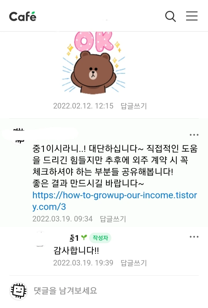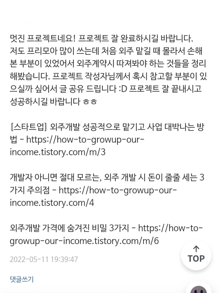 이 플랫폼에서는 외주를 맡기기 위해 올라온 게시글에 댓글로 저의 블로그 포스팅을 노출시켰습니다. 블로그 포스트를 노출시킨 이유는 지금 당장 외주계약을 해야 하는 사람들은 제 블로그 내용이 도움 된다고 판단되면 곧바로 제 전자책을 구매하는 링크로 들어올 확률이 굉장히 높다고 생각했기 때문입니다. 그래서 굳이 전자책 상세페이지를 노출시키는 것보다 더 디테일한 내용이 담겨있는 블로그 포스트를 노출시켰습니다.