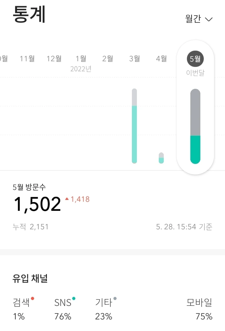 티스토리 블로그에 올린 게시글의 3월부터 5월까지 총조회수는 2,100회입니다.