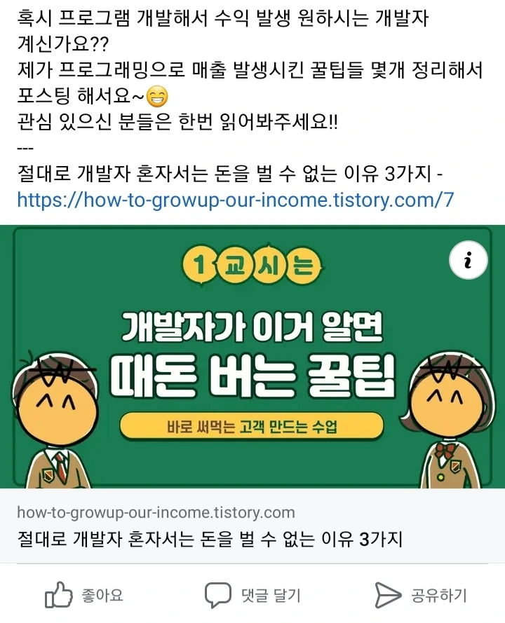 첫 번째로 페이스북 그룹을 활용했습니다. 개발자 그룹에서는 개발로 돈 버는 방법을 알려주는 블로그 글을 공유했습니다. 그 블로그 글에서는 프로그래밍을 통해 매출을 내는 방법을 알려주고, 글의 끝에는 저의 전자책을 알리는 문구를 추가했습니다.