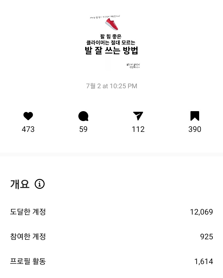 계속해서 카드뉴스를 게시함. 소통도 지속적으로 진행함. 스토리에 팔로워들이 궁금해 하는 사항들을 질문 받음. 발 잘 쓰는 방법에 대한 게시물은 갑작스레 반응이 좋았다. 보통 좋아요 200 수준인데, 이 게시물은 좋아요 470개, 도달 계정은 12,000개 정도다.