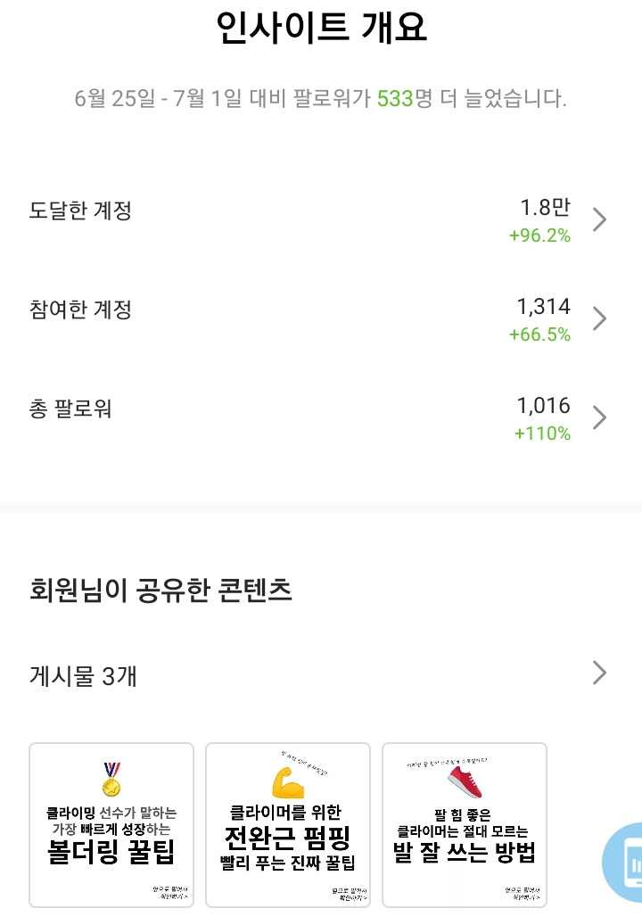 카드뉴스 내용은 해외 클라이밍 유튜버들이 업로드한 인기 높은 영상을 해석해서 재가공했다. 따라서 콘텐츠의 내용은 이미 검증된 것이다. 그렇기 때문에 이 내용들로 내가 트래픽을 끌어당기지 못하면 카드뉴스의 내용이 문제가 아니라, 내가 사람을 끌어모으는 능력이 문제인 것으로 결정지을 수 있다.