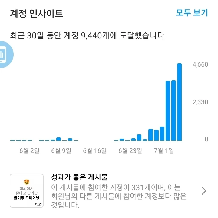 그러나 이 게시물 이후의 전완근 펌핑 관련 게시물은 계정도달에 큰 비중을 차지하는 탐색탭에서 전혀 유입이 되지 않았다. 원인 파악을 위해 검색해보니 해시태그 복붙 남용이나 계정에 동영상이 하나도 없어서 그렇다고 한다. 그래서 최근에 영상 하나를 지웠기 때문에 영상 하나를 추가했고 이 다음 게시물부터는 해시태그를 복붙하지 않았다.