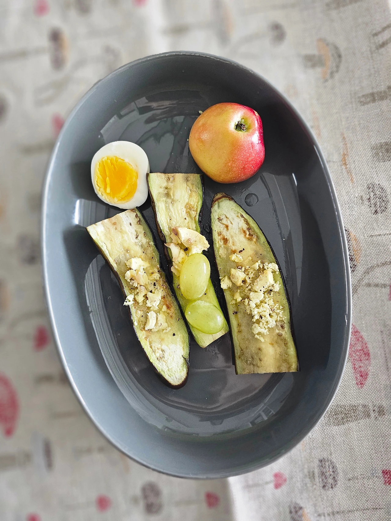 옆에는 포도 두 알, 사과 하나, 달걀 반쪽.