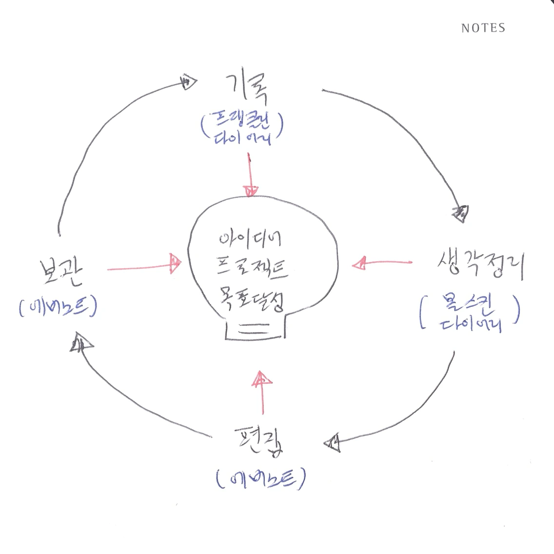 본인이 실천하고 있는 패턴은 아래의 다이어그램과 같다. 기록 -> 생각정리 -> 편집 -> 보관의 4가지 패턴으로 이뤄져 있고 매일 매일 실천해 나가고 있다.