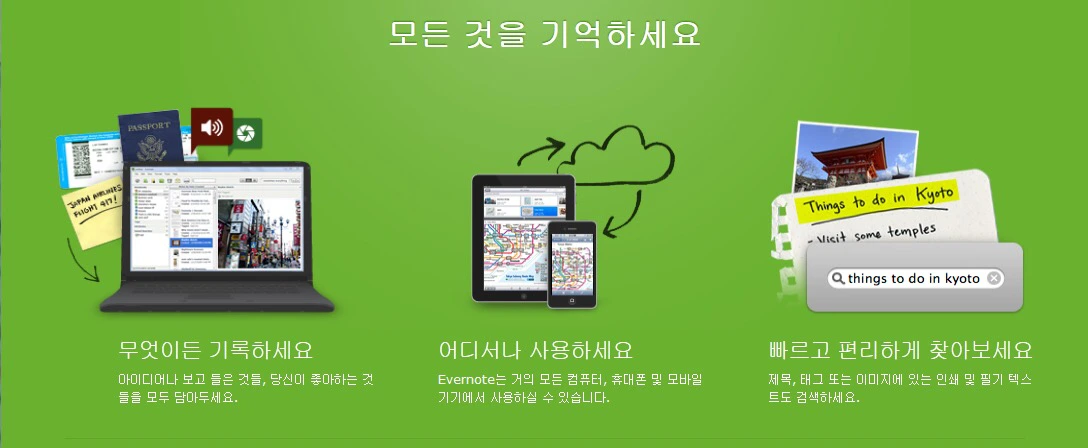그렇다면 이런 자료들은 어디에 보관을 해야할까? 예전처럼 노트북의 폴더에 보관해 놓고 다닌다면 항상 노트북을 가지고 있어야지 그 자료들을 검색해서 찾아볼 수 있다. 하지만 항상 노트북을 가지고 다닐 수는 없는 노릇이다. 그래서 본인은 클라우드 서비스를 적극 활용하고 있다. 그 중에서도 에버노트를 추천한다. 에버노트는 스마트폰과 테블릿 그리고 노트북 모두에 연동되어 어느 한곳에서 작업을하고 보관을 해 놓으면 모든 디바이스에서 같은 내용을 찾아볼 수 있다. 그래서 본인은 에버노트에 모든 자료를 보관해 놓고 필요할때마다 검색해서 찾아보고 다시 편집을 하면서 아이디어를 구체화 시킨다.