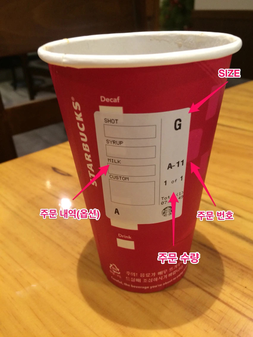 매일 아침 커피 한잔 하며 하루 일과를 정리하기 위해 스벅에 오는데 오늘 무심코 잔을 보니 스티커가 붙여있다 이게 뭐지? 하고 자세히 보니 주문내역이 기록되어있는 스티커였다