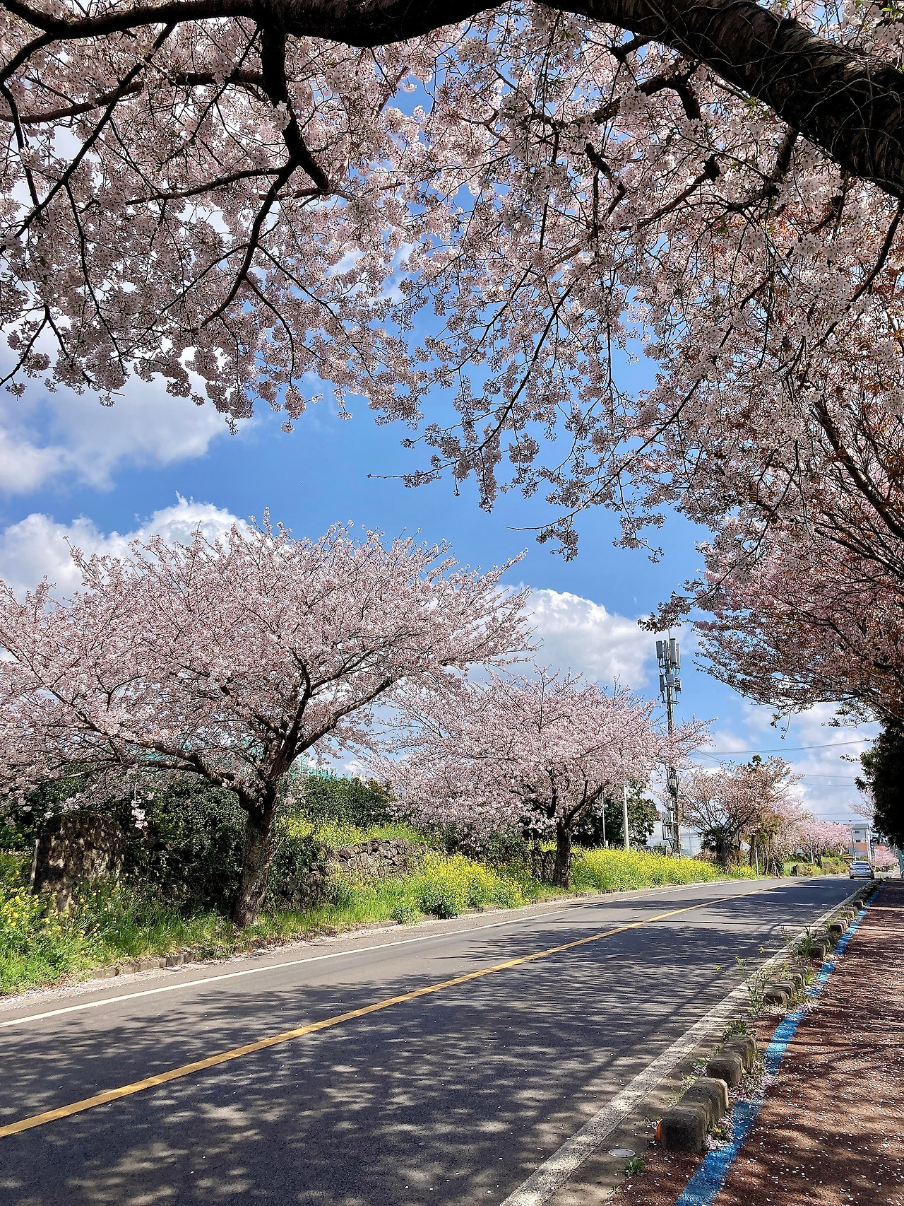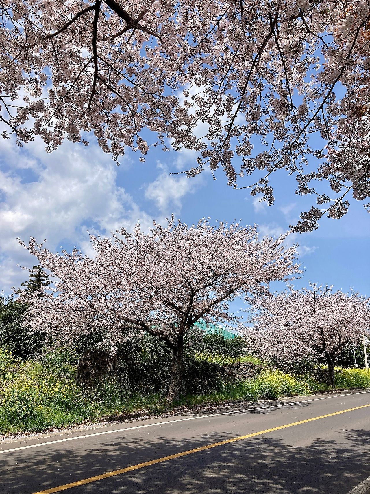 내가 제주에서 벚꽃 구경을 하리라곤 상상도, 계획에도 없었는데 이렇게 떨어진 꽃잎마저 낭만적인 길을 사람도 차도 많이 다니지 않아 오롯이 내가 독차지하는 기분이라니. 숨은 벚꽃 명소를 찾아낸 기분이라 으쓱했다. 4박 5일 동안 매일 아침저녁으로 나에게 인사를 건네준 고마운 벚꽃 나무들.